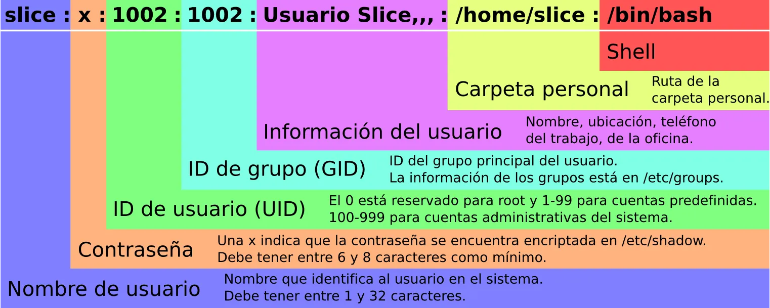 Section titled “✏️ Ejercicios”1. Crea un usuario utilizando useradd y comprueba si se ha creado su home.2. Borra un usuario utilizando deluser y comprueba si se ha borrado su home.3. Muestra las últimas líneas de /etc/passwd4. Crea un grupo grupo15. Añade a los dos usuarios creados a este grupo.6. Borra los grupos creados7. Borra los usuarios creadosman