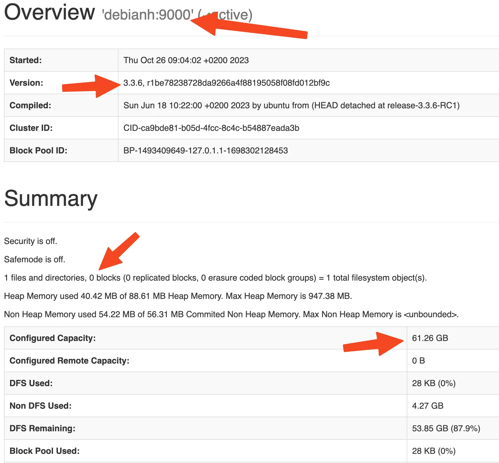 -rw-r--r-- 1 hadoop hadoop 42 oct 26 09:09 edits_0000000000000000001-0000000000000000002-rw-r--r-- 1 hadoop hadoop 42 oct 26 10:09 edits_0000000000000000003-0000000000000000004-rw-r--r-- 1 hadoop hadoop 42 oct 26 12:34 edits_0000000000000000005-0000000000000000006-rw-r--r-- 1 hadoop hadoop 1048576 oct 26 12:34 edits_inprogress_0000000000000000007-rw-r--r-- 1 hadoop hadoop 401 oct 26 10:09 fsimage_0000000000000000004-rw-r--r-- 1 hadoop hadoop 62 oct 26 10:09 fsimage_0000000000000000004.md5-rw-r--r-- 1 hadoop hadoop 401 oct 26 12:34 fsimage_0000000000000000006-rw-r--r-- 1 hadoop hadoop 62 oct 26 12:34 fsimage_0000000000000000006.md5-rw-r--r-- 1 hadoop hadoop 2 oct 26 12:34 seen_txid-rw-r--r-- 1 hadoop hadoop 214 oct 26 08:35 VERSION$ cat VERSION#Thu Oct 26 08:35:28 CEST 2023namespaceID=623528578blockpoolID=BP-1493409649-127.0.1.1-1698302128453storageType=NAME_NODEcTime=1698302128453clusterID=CID-ca9bde81-b05d-4fcc-8c4c-b54887eada3blayoutVersion=-66Si paramos el cluster con stop-dfs.sh y lo volvemos a arrancar los números en los nombres de ficheros incrementan.