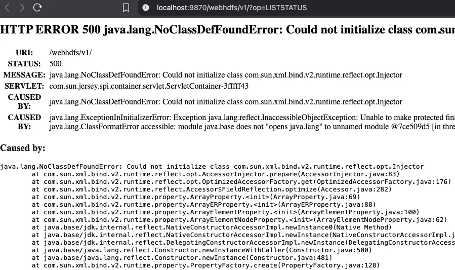 Este error se debe a que tenemos instalada la versión 17 de openjdk y hadoop es compatible hasta la versión 11.