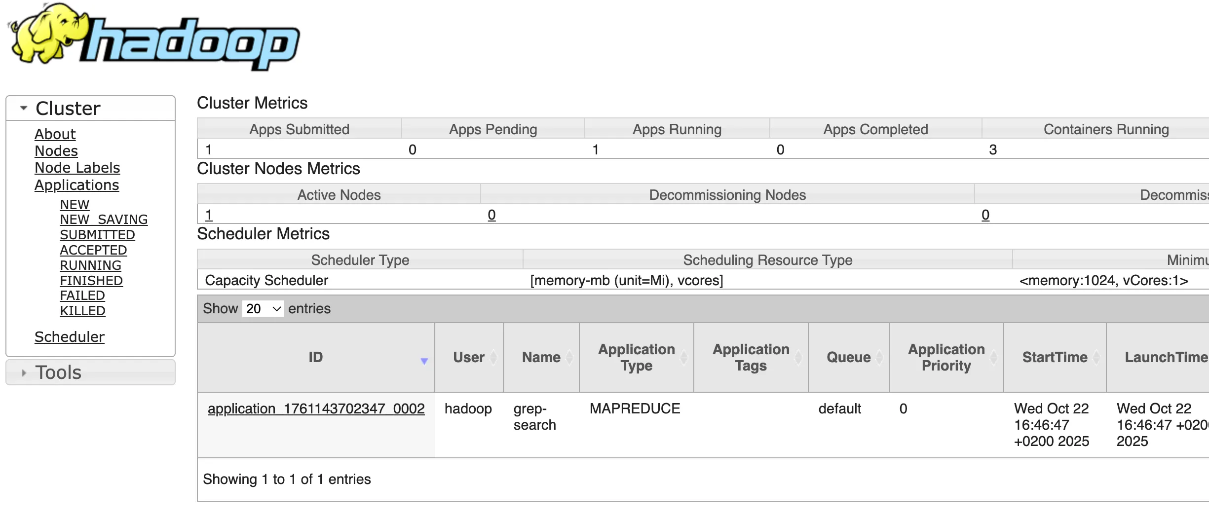 # Antes de ejecutar cargamos la URL donde se pueden ver los jobs de YARN$ hadoop jar hadoop-mapreduce-examples-3.3.6.jar grep /tmp/entrada /tmp/salida/ 'kms'Si accedemos a la URL de yarn veremos información del trabajo que ha realizado.
