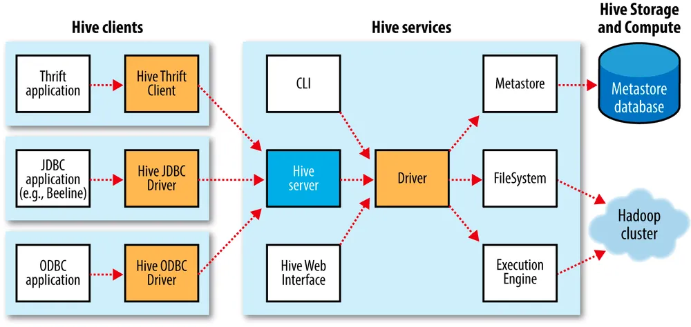 - Metastore: Almacena información sobre el esquema de datos y las particiones en una base de datos relacional para facilitar la administración de metadatos.