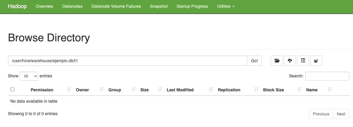 show tables;- Vamos a la página de hadoop (puerto 9870) y localizamos la base de datos.